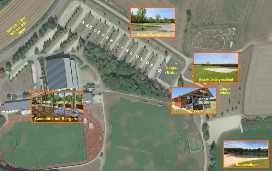 Beachvolleyball-Feld, Badeweiher, Mountainbike-Parcour und Basketballfeld können von uns genutzt werden!